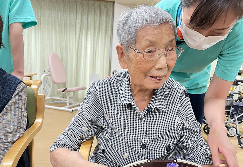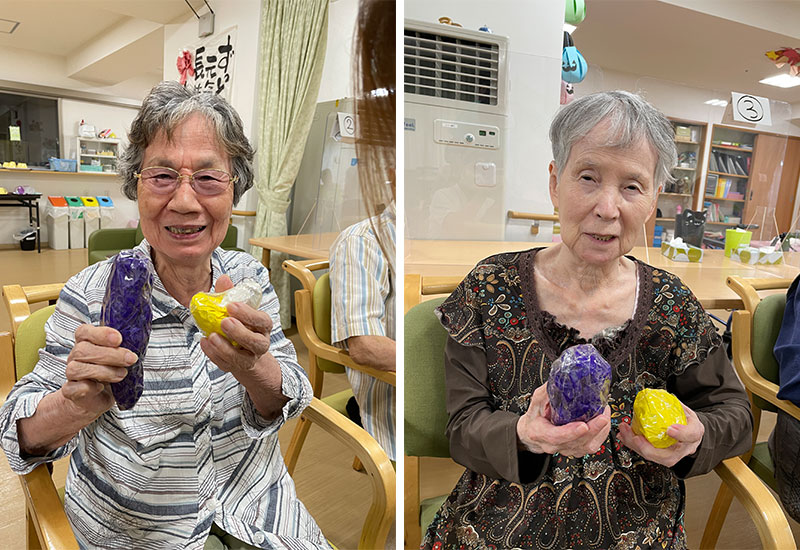 併設のデイサービスで季節のゲームを行いました。まだまだ暑いですが、秋の大収穫祭「芋掘りゲーム」です。 段ボールの中から手探りでイモ類を掘り出してもらいます。他の方が探していると簡単そうに見えますが、自分の番になるとなかなか探せないようです。指先に集中して、紫イモ、じゃがいも、きのこ、そして松茸をゲットした方も見えました。