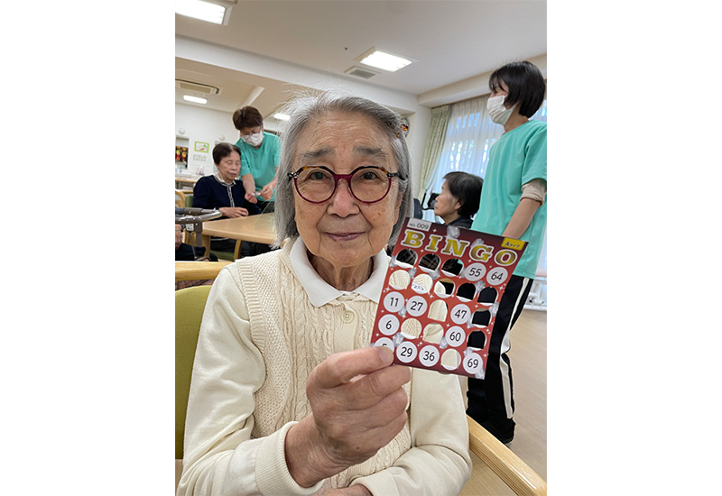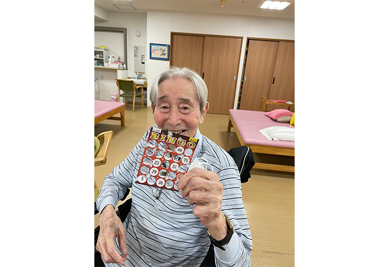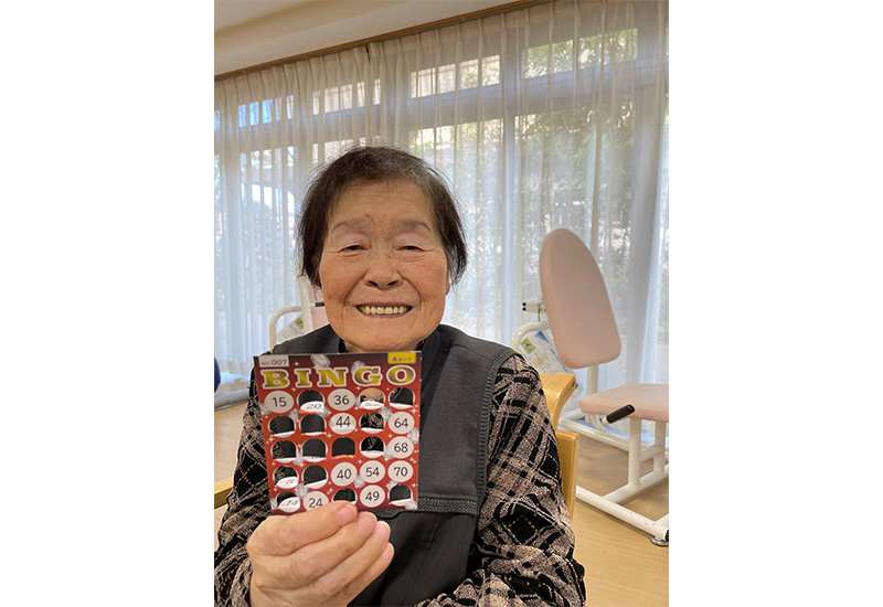 併設のデイサービスで、ビンゴ大会を行いました。 ビンゴカードとホワイトボードに書かれた数字を見比べ、周りの人の『リーチ!』『ビンゴ!』の声にドキドキしながら楽しんでもらいました。 ビンゴした時の皆さんの表情がいいですねぇ(^^♪
